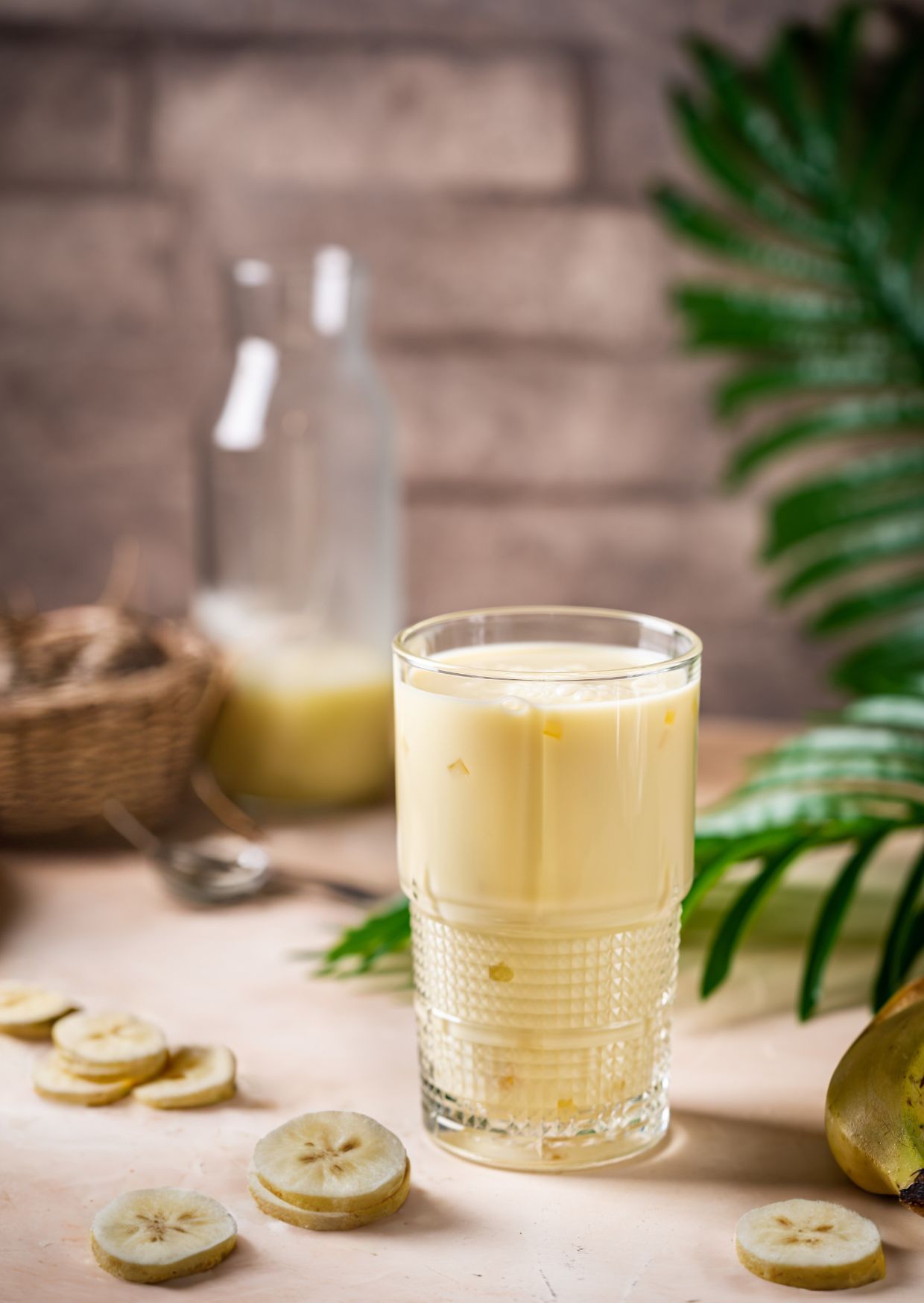 V blender (mešalnik) dodaj liofilizirano banano, rum, bananin liker, kavni liker, led, sirup agave in smetano. Zmiksaj, da dobiš gladko teksturo.